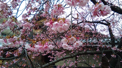 2020.2.12蜂須賀桜が開花しました。(左の写真) 2020.2.22撮影 8分咲きになりました。(中、右の写真)