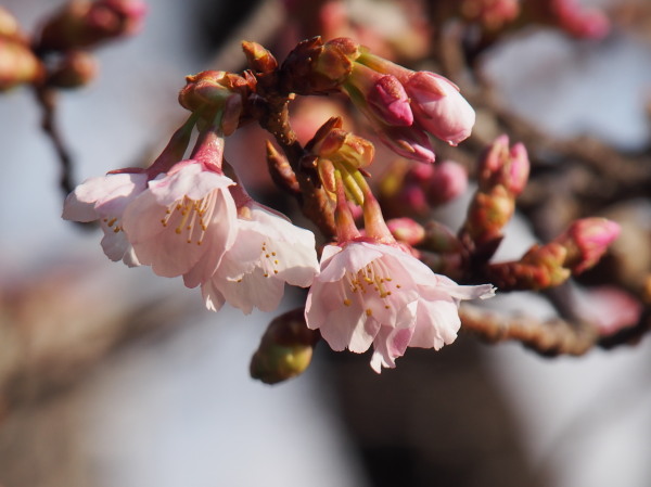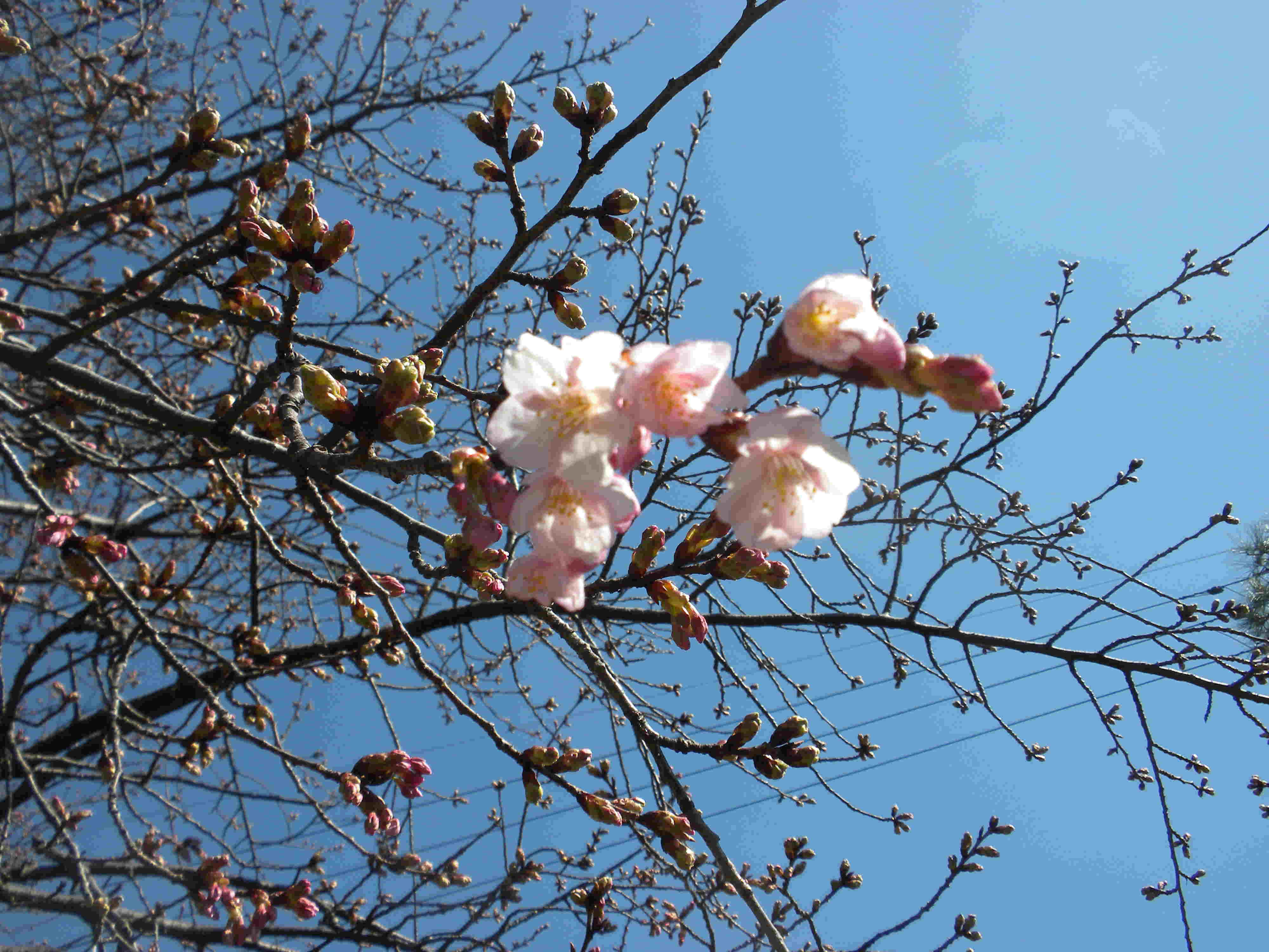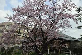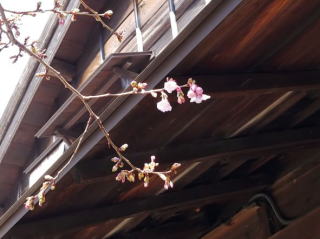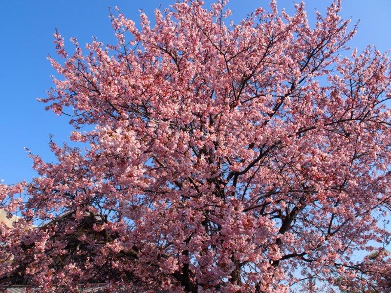 2020.2.12蜂須賀桜が開花しました。(左の写真) 2020.2.22撮影 8分咲きになりました。(中、右の写真)